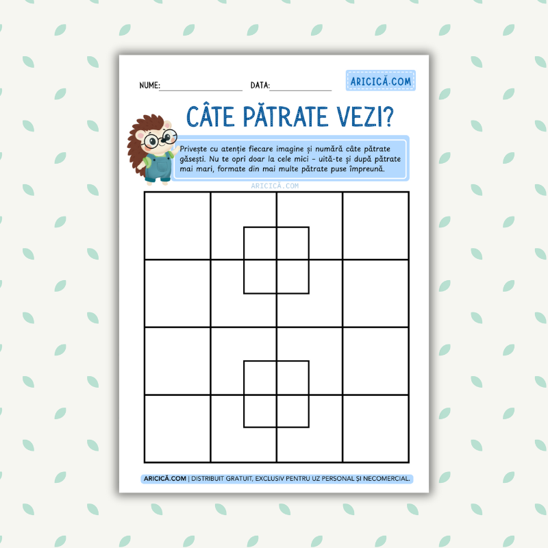Această fișă educativă este o provocare distractivă pentru copii, menită să dezvolte atenția la detalii, logica și concentrarea. La prima vedere, pare simplu: trebuie doar să numeri pătratele din imagine. Totuși, exercițiul îi încurajează pe cei mici să privească mai atent și să descopere nu doar pătratele mici, ci și pătratele mai mari, formate din combinarea altora.