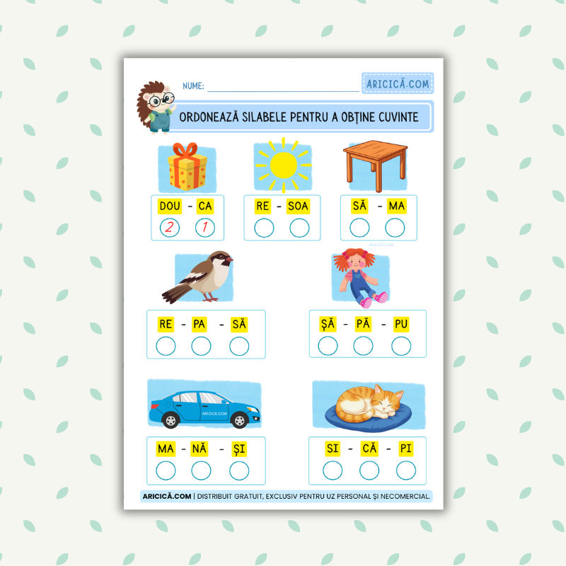 Fișă PDF printabilă „Ordonează silabele pentru a obține cuvinte”, activitate pentru clasa pregătitoare și clasa I. Copiii aranjează silabele pentru a forma cuvinte uzuale (cadou, soare, masă, pasăre, păpușă, mașină, pisică), exersând conștiința fonologică, citirea și vocabularul. Ideală pentru clasă, acasă, after-school sau logopedie; se poate lamina și refolosi cu markere lavabile. Format A4, o pagină, PDF de calitate, gata de tipărit. Resursă gratuită, utilă pentru centre de literație, jocuri de cuvinte și recapitulare rapidă. Descarcă fișa și transformă învățarea silabelor într-un exercițiu vizual, clar și distractiv.